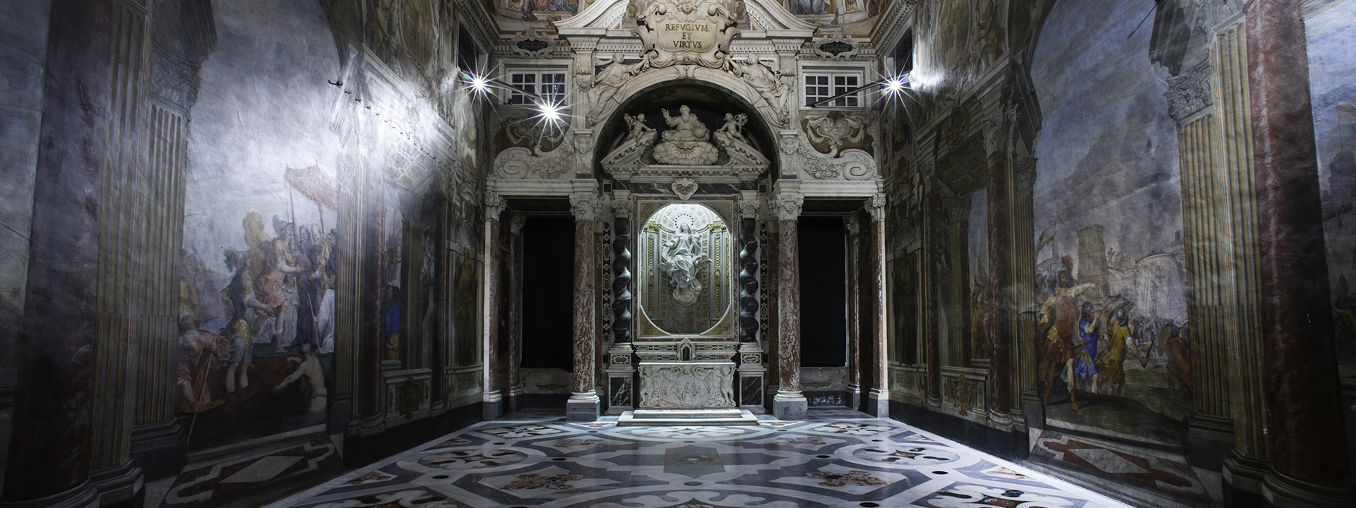The core of the building dates back to 1291, but its look changes visibly only at the end of the sixteenth century at the hand of Vannoni who reshapes the environment in order to represent the extraordinary political and economic power achieved by the Republic during the Siglo de los Genoveses. Noteworthy is the Chapel realized by G.B. Carlone in the first half of the seventeenth century in the honor of Virgin Mary.