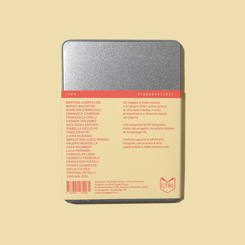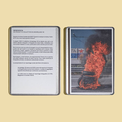 Un’estate fa (CTRL, 2022) è un reportage visivo e corale che inizia il 21 giugno 2021 quando il collettivo Arcipelago-19 propone una call aperta a fotografi e fotografe da tutta Italia per raccontare un’estate che, dopo i vari lockdown, sembrava voler essere vissuta più serenamente. Dai molti scatti arrivate ne è nato un racconto capace di narrare un viaggio in Italia, fatto di persone, luoghi, oggetti e situazioni nati da sguardi inediti e diversificati – per contenuto e provenienza – che hanno contribuito a plasmare l’immaginario di quell’estate. Un’estate fa è diventato poi una “Latta” di CTRL, con 21 fotografie di Martina Albertazzi, Marco Balostro, Giancarlo Barzagli, Emanuele Camerini, Francesca Cirilli, Carmen Colombo, Gaia degli Esposti, Isabella Dellolio, Fabio Demitri, Ilaria di Biagio, Sebastiano Luca Insinga, Valerio Muscella, Sara Nicomedi, Luca Pegorer, Fabrizio Pelaggi, Federico Perruolo, Francesco Pistilli, Chiara Scardozzi, Giulia Ticozzi, Cristina Vatielli, Virginia Zoli.