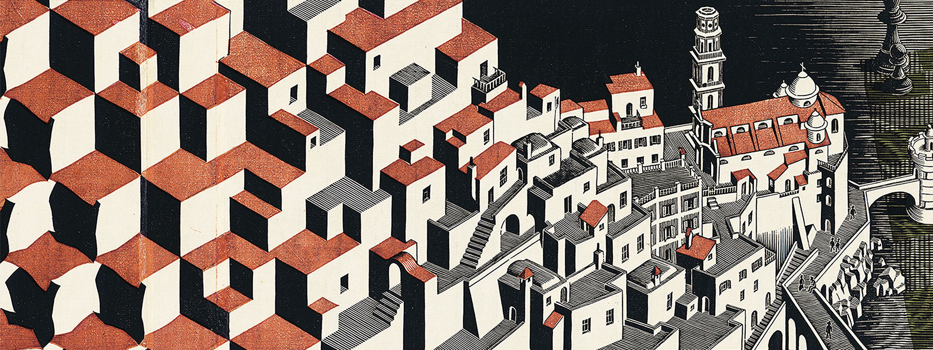 Escher è un chiaro esempio di costruzione, su principi matematici, di schemi visivi e allo stesso tempo, di fuga dagli stessi.