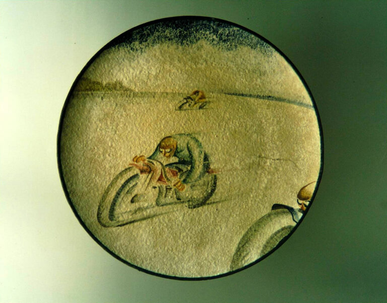 Romeo Bevilacqua, Casa Giuseppe Mazzotti, Albisola, Motociclisti, 1932-1934, piatto in terracotta invetriata e decorata con colori matt e smalti, diam. cm 37, Wolfsoniana – Palazzo Ducale Fondazione per la Cultura, Genova