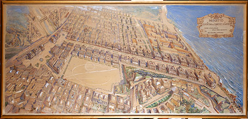 La sistemazione urbanistica delle aree limitrofe, inserite nel Piano regolatore per le zone centrali (1932), fu quindi sancita dalla realizzazione del progetto di Marcello Piacentini per Piazza della Vittoria, cui concorsero diversi artisti e architetti allora attivi a Genova, tra i quali Beniamino Bellati e Alfredo Fineschi. Ai centri del commercio e della finanza, come Piazza Dante, edificata alla fine degli anni trenta e qui documentata dal palazzo Terzano di Giuseppe Crosa di Vergani, improntato nella sua linea austera ai modelli architettonici d’oltreoceano, si contrapposero infine i luoghi dello svago e del tempo libero, come nel caso della sede dello Yacht Club, nuovamente opera di Crosa, o le Piscine d’Albaro di Paride Contri.