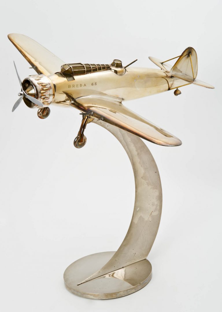 Aeropittura. La vicende e i diversi indirizzi espressivi dell’aeropittura futurista degli anni Trenta – il manifesto apparve nel 1929 – sono ripercorsi mettendo a confronto dipinti e disegni delle due collezioni (tra gli artisti Uberto Bonetti, Alessandro Bruschetti, Tullio Crali, Mino Delle Site, Giovanni Korompay, Tato). Anche in questo caso i modelli in legno e in metallo dei più famosi aeroplani civili e militari dell’epoca contribuiscono a documentare l’evoluzione tecnologica e industriale in questo specifico settore produttivo dei mezzi di trasporto. Un posto speciale è dedicato infine al grande bozzetto dell’architetto Virgilio Marchi per un Palazzo dell’aria (1929) da edificarsi a Roma sulle rive del Tevere, una risposta in chiave più “lirica”, ma anche monumentale e novecentesca, alla visionarietà metropolitana che aveva contraddistinto le visoni urbanistiche di Antonio Sant’Elia e di Mario Chiattone.