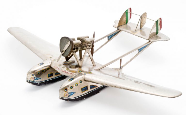 Le trasvolate atlantiche di Italo Balbo. Le spettacolari imprese del ras di Ferrara – la prima (1931) in Brasile e la seconda (1933) negli Stati Uniti (Chicago e New York), conosciuta come Crociera aerea del Decennale poich&eacuta doveva commemorare i primi dieci anni del fascismo al potere – ebbero una risonanza mediatica straordinaria in tutto il mondo occidentale e diedero al Quadrumviro una tale fama da suscitare l’invidia di Mussolini. Queste due imprese sono documentate in mostra dai manifesti commemorativi, realizzati da alcuni tra i più importanti cartellonisti dell’epoca (da Marcello Dudovich a Umberto Di Lazzaro e Lugi Martinati), dai modelli degli aeroplani utilizzati – in particolare l’idrovolante Savoia Marchetti S55 – e da alcuni gadget (souvenir, orologi, calamai, fotografie, giochi per bambini, spartiti musicali) che vennero prodotti in quell’occasione. La sezione è completata dai bozzetti per le decorazioni murali e dalle fotografie degli interni del Ministero dell’Aeronautica a Roma, iniziato nel 1929 dall’architetto Roberto Marino, e dal dipinto di Enrico Prampolini Aeroritratto simultaneo di Italo Balbo, realizzato dopo la sua morte ancora oggi misteriosa.