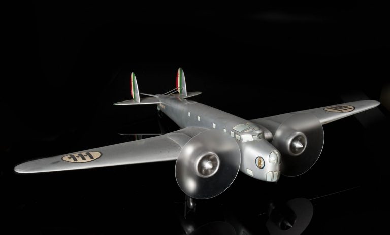 L’industria aeronautica italiana e l’aviazione civile. Vari modelli di aerei – dall’ambizioso Dornier Do.X del 1929, un colossale idrovolante da 70/100 passeggeri, ai Savoia Marchetti modelli S74 Millepiedi e SM83 Ala Littoria dei tardi anni Trenta – dialogano con le vedute degli stabilimenti Caproni a Taliedo raffigurate nelle acqueforti di Carlo Vitale e con il materiale promozionale per l’Ala Littoria, la prima compagnia aerea di linea italiana di proprietà statale, fondata il 28 ottobre 1934, che effettuava servizi postali e di trasporto passeggeri.
