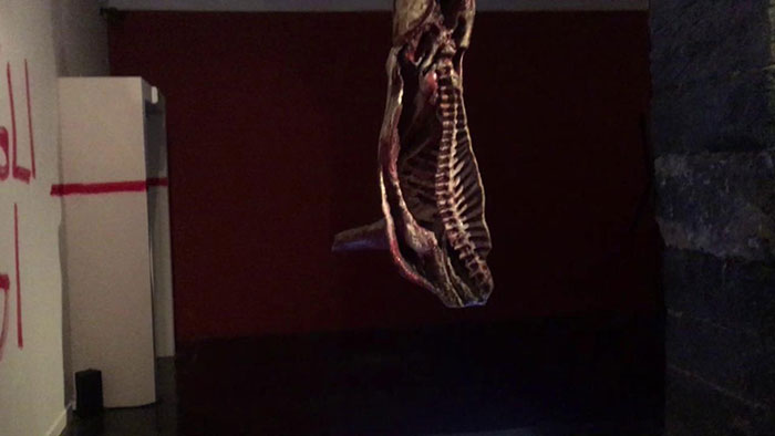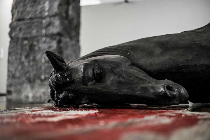 Avvolti dalle musiche inquietanti di Andrea Chenna, i visitatori si imbattono in maestosi cavalli, tappeti di sangue, una jeep esplosa, bestie macellate, mentre i performer, ciascuno chiuso in un box trasparente, recitano brevi estratti dal primo atto dell’opera di Sofocle, evocando una comunità che si interroga sulle responsabilità dell’uomo nel disastro, in un crudele gioco del destino in cui si è ora vittime, ora colpevoli.
