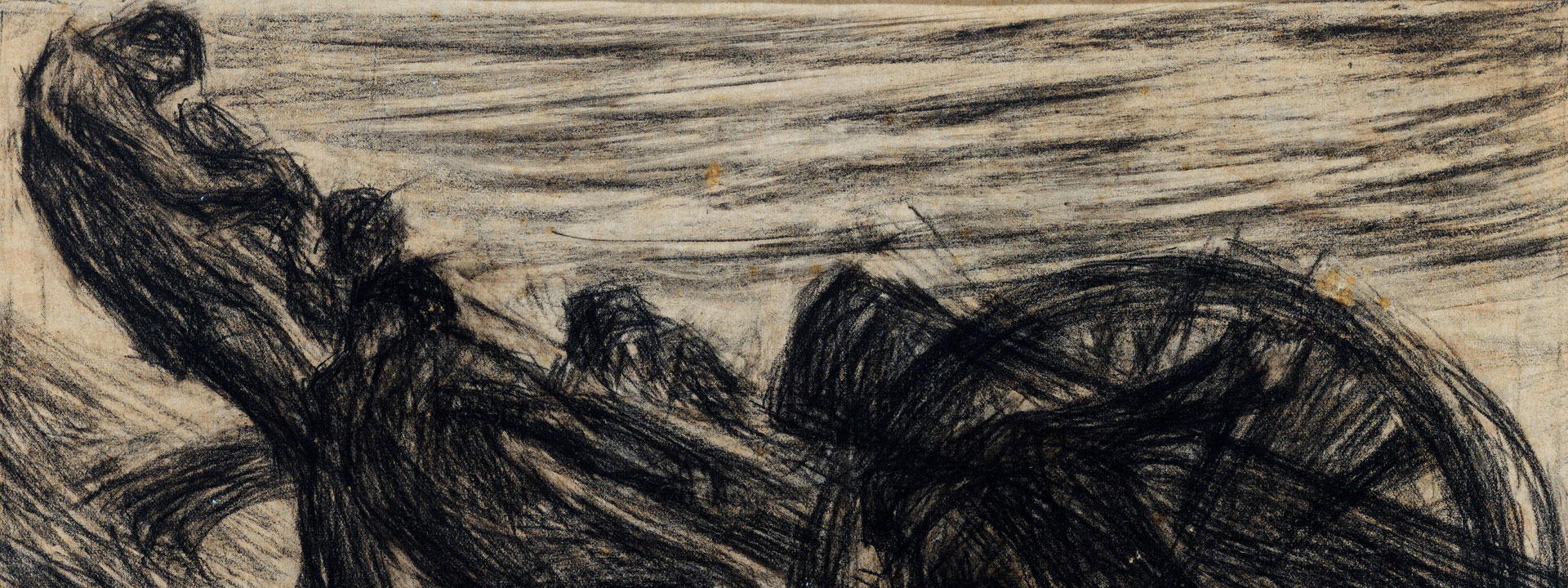 Nel 1914 allo scoppio della Prima Guerra Mondiale Giuseppe Cominetti, residente dal 1909 a Parigi, dove aveva preso studio prima a Montparnasse e poi a Montmartre, decise di arruolarsi volontario e partì per il fronte francese. Testimone dei drammatici esordi di quella che sarebbe stata destinata a diventare una logorante e atroce guerra di trincea, il pittore cominciò a fissare sulla carta di getto, in disegni realizzati a crayon conté (un particolare carboncino arricchito da cera e argilla), le sue impressioni belliche. A questa produzione grafica attese anche dal 1916 al 1918 sul fronte italiano, ma questa volta ufficialmente, come disegnatore inviato di stampa.