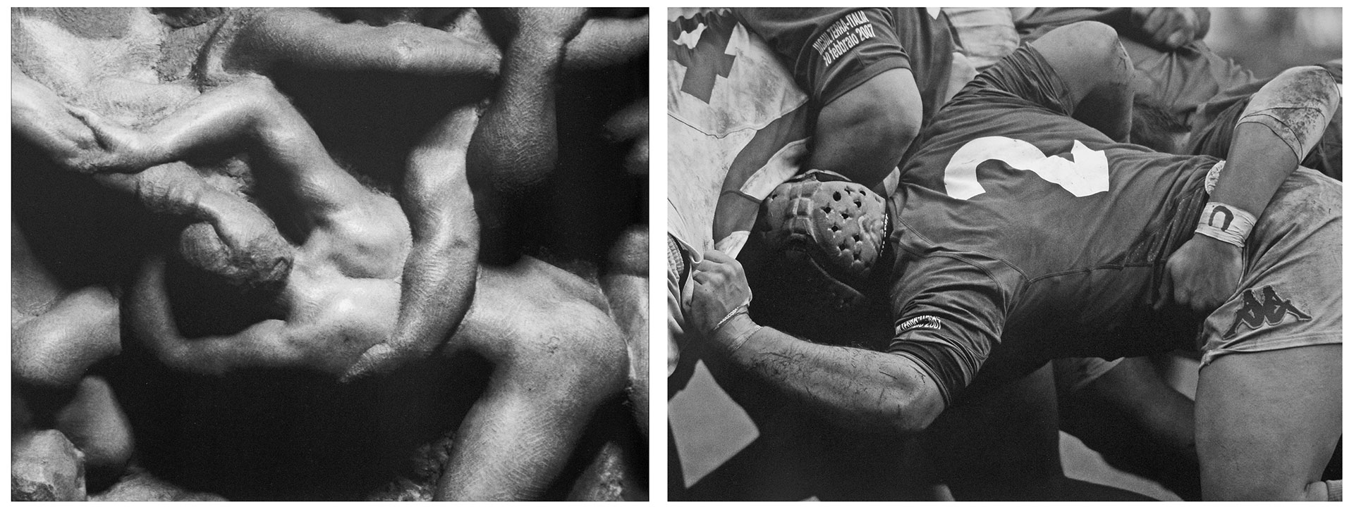 Creare suggestioni visive attraverso l’accostamento analogico di immagini fotografiche e grandi opere classiche: l’intuizione di Massimo Verdino nasce dalla visita a Firenze di una mostra su Michelangelo, durante la quale rimane fortemente colpito dalla Battaglia dei centauri. L’equilibrio e la gestualità classica dei corpi scolpiti da Michelangelo hanno richiamato alla mente l’equilibrio e la gestualità che Verdino notava nelle azioni di rugby: del resto il rugby, come altri e forse ancor più di altri sport, è un agone.