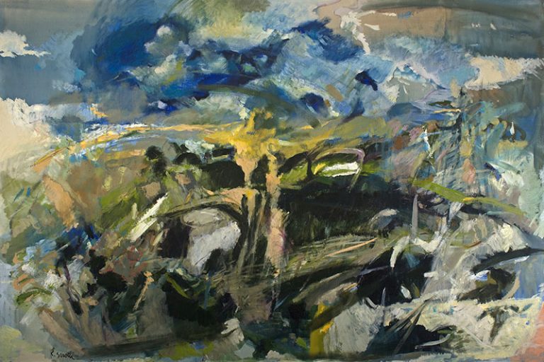 Strettamente connesse a questa tematica, le due sezioni successive – Eventi naturali e Tane, rocce e forre – documentano rispettivamente gli esiti del processo cognitivo determinato dalla sua analitica investigazione dei fenomeni naturali e le prove pittoriche influenzate dal suo soggiorno di studio nel 1968 a Londra dove, recatosi grazie alla Borsa di Studio Duchessa di Galliera, riscoprì e studiò la pittura di Turner, di Whistler, di Bacon, ma soprattutto quella di Graham Sutherland, la cui influenza sulla sua ricerca pittorica traspare nell’elaborazione di forme organiche, allusive a una natura inquietante e misteriosa.